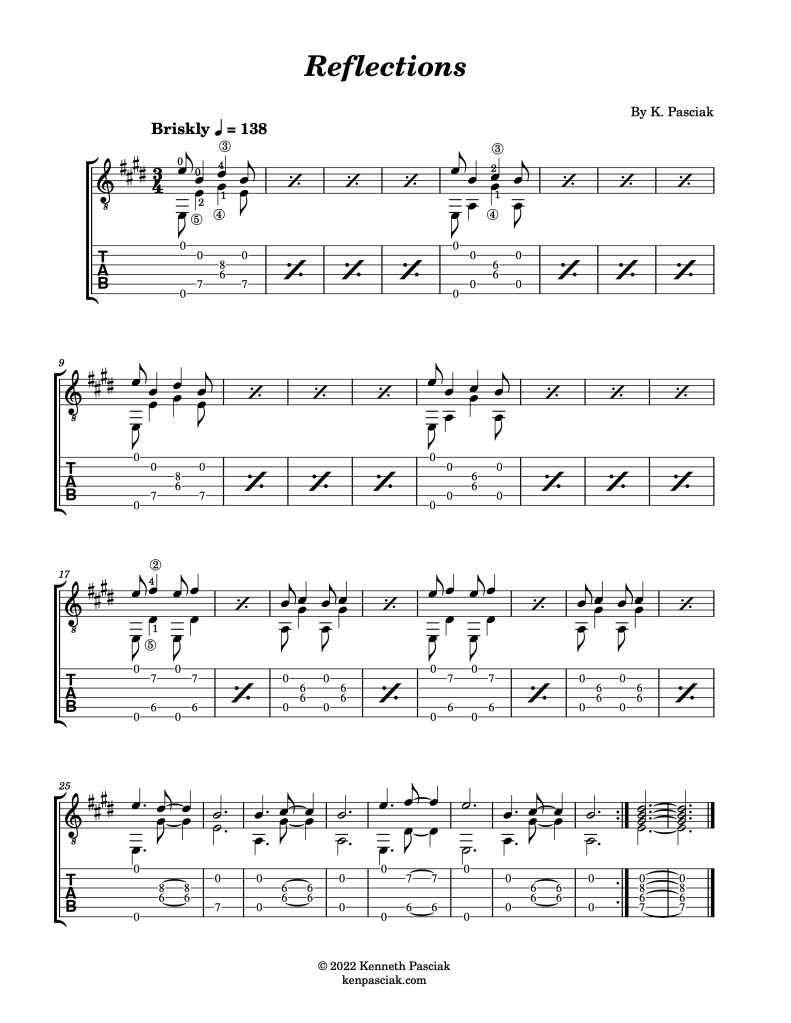 (Please consider supporting this site! Sheet music and tablature for Reflections and other guitar studies available here: Innovative Studies for Guitar – Volume 2)