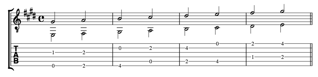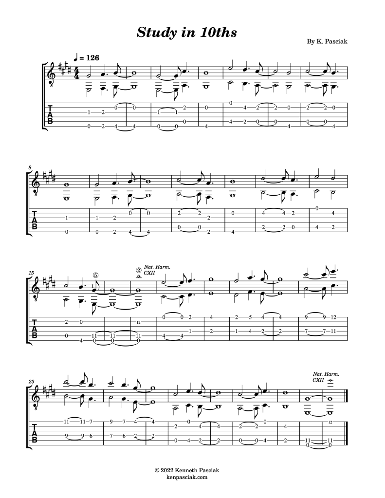 This study in E major incorporates parallel tenths throughout. Using tenths exclusively in a composition can be challenging. To make things a bit more interesting, I added some rhythmic variations. I also used natural harmonics in the middle and end of the piece breaks the parallel tenth pattern and punctuate the two main phrases, giving the piece some shape.
