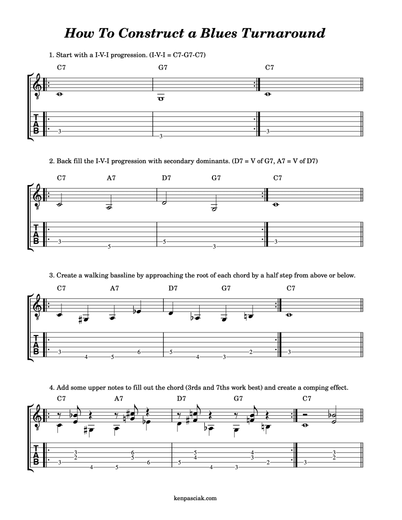 A turnaround is a short chord progression that takes you back to the start of a song, a solo section or even takes you to a new key. Sometimes they are used as an introduction or an ending to a song. The chords of a turnaround range from simple to complicated, but all turnarounds are basically a harmonic embellishment or an expansion of a basic I-V-I progression. Let’s see how to build a turnaround from scratch!