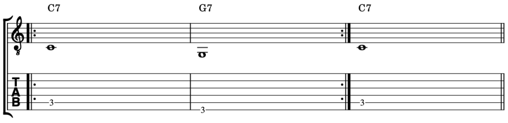 First, start with a I-V-I progression. In the key of C, the I chord is C and the V chord is G. In a blues, it’s best to use 7th chords, so the I-V-I progression is C7-G7-C7.