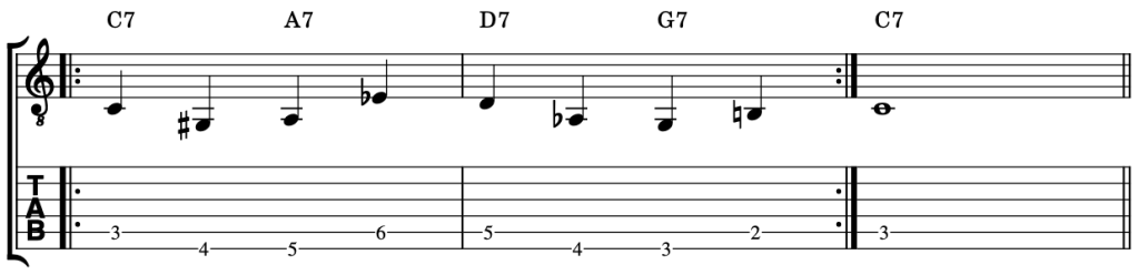 Now that we have the basic harmonic structure of the turnaround, we can add some embellishments to it to make it sound more musical. Let’s start by adding a bassline. To add a simple walking bassline, approach the root of each chord by half step from above or below. Here, G# goes to A, Eb to D, Ab to G, and B to C. Try experimenting with other possibilities.