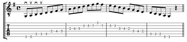 Start with a two-octave scale, such as this G major scale. Play it slowly and use a metronome. Listen to each note to make sure your playing is clean. Use alternating picking for the entire scale, even when changing strings. I prefer to play scales legato, and I will use a clean sound when playing on an electric guitar.