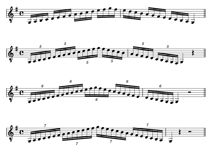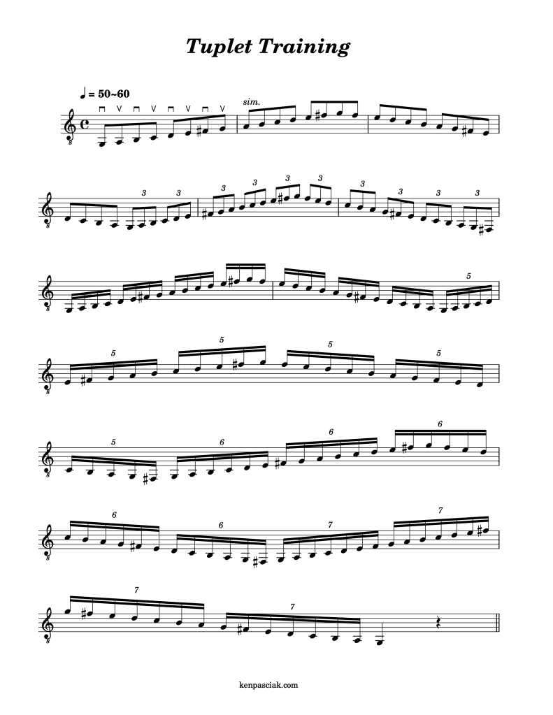 A simple way to improve your playing is to perform scales using various tuplets. Most musicians are used to playing scales with quarter, eighth or sixteenth notes, but using tuplets will help improve your rhythmic accuracy and hand coordination, not to mention your mental focus and listening skills.