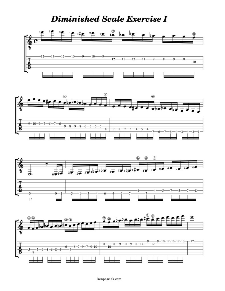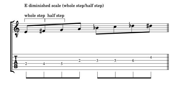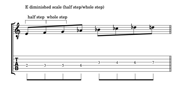 A diminished scale is an eight-note scale, or octatonic scale, made up of a series of alternating whole steps and half steps from the starting pitch. One way to make sense of these scales is to use a diminished 7th arpeggio as their foundation.