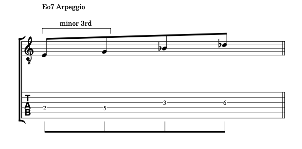 The Eo7 arpeggio below has the notes E, G, Bb & Db. Each chord tone is separated by a minor 3rd (3 half steps).
